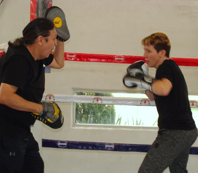 Layla golpea las manoplas sostenidas por su entrenador Luis Tapia