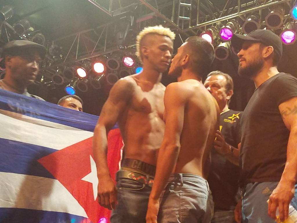 Esta tarde durante el pesaje oficial del evento Mano a Mano entre aceres contra paisanos que se llevara a cabo este martes en el Cannary Hotel del Norte de Las Vegas los cubanos tenían tremenda bulla cuando sus compatriotas subían a la bascula. Los primeros en subir a la pesa fueron el sinaloense Eduardo Ramírez y el apodado “Problemón” Leduan Barthelemy ambos completaron 126.2. Le toco el turno a isleño Iván Jiménez contra el orgullo de Tijuana Brian Figueroa en la división de los ligeros. También en las 130 libras se enfrentaran Duarn Vue alias “La Tormenta” contra el mexica-cubano Alejandro “Popo” Salinas.