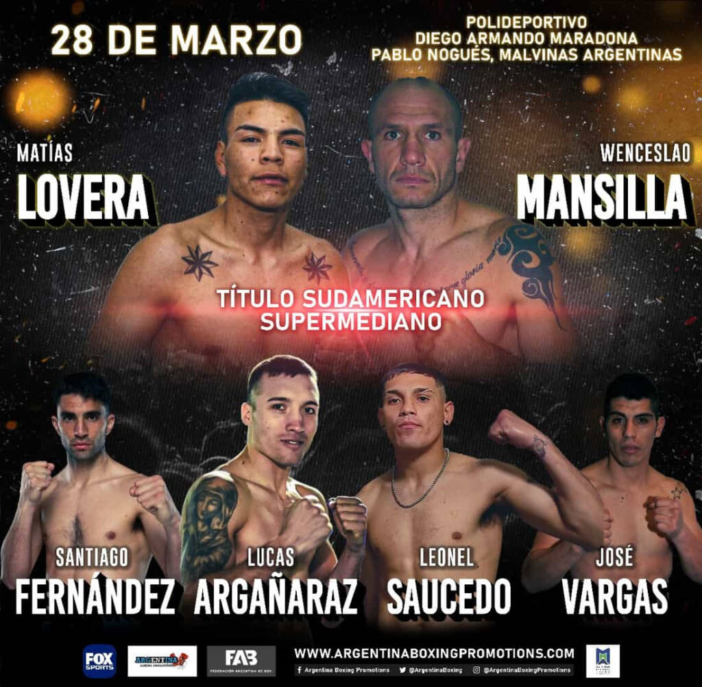 Un gran evento se acerca. Con una esperada revancha titular, jóvenes figuras y atractivos choques, continúa “Argentina Boxing” por Fox Sports. El campeón sudamericano mediopesado, el correntino Matías “Monzón” Lovera, se enfrentará al ex monarca latino entrerriano Wenceslao “Peligro” Mansilla, en disputa del título sudamericano supermediano, que se encuentra vacante, en una esperada revancha, en el combate estelar de la velada que se desarrollará este viernes, 28 de marzo, en el Polideportivo Digo Armando Maradona, en Pablo Nogués, Malvinas Argentinas, Buenos Aires, Argentina, en una nueva producción de Argentina Boxing Promotions, de Mario Margossian, que será televisada en vivo a través de Fox Sports a partir de las 21 para Argentina y todo el continente en su ciclo Argentina Boxing, con el apoyo del reconocido sitio de apuestas Betsson, como main sponsor.