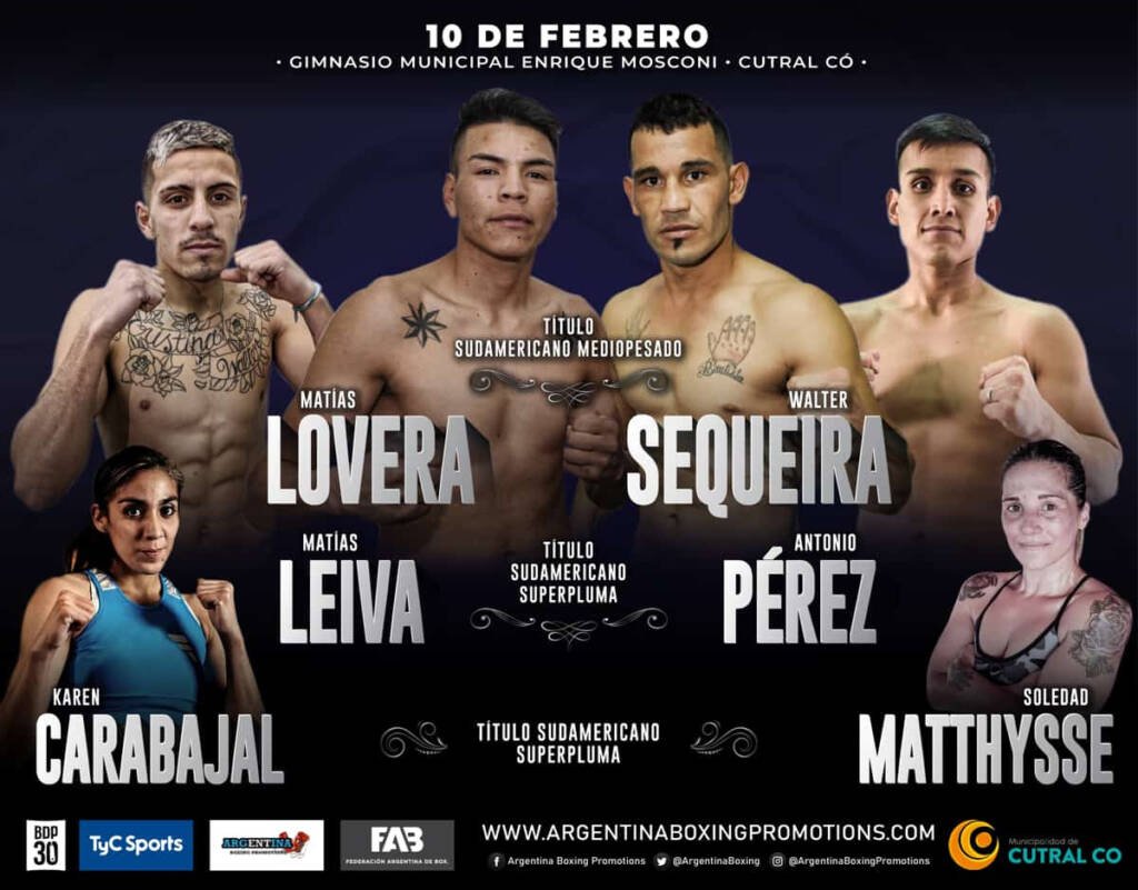 Una jornada explosiva, con tres choques titulares, figuras de renombre y jóvenes prospectos, llega de la mano de Argentina Boxing Promotions por TyC Sports. El campeón sudamericano mediopesado, el correntino Matías “Monzón” Lovera, se enfrentará al bonaerense Walter “Yacaré” Sequeira, intentando defender por primera ocasión su corona, en uno de los combates estelares de la velada que se desarrollará este sábado, 10 de febrero, en el Gimnasio Municipal Enrique Mosconi, de Cutral Có, Neuquén, Argentina, en una nueva producción de Argentina Boxing Promotions, de Mario Margossian, que será televisada en vivo a través de TyC Sports y TyC Sports Play a partir de las 23:40 para Argentina y toda América en su ciclo Boxeo de Primera. TyC Sports Play iniciará a las 22.