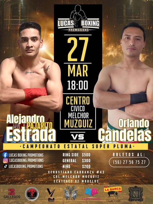 En turno estelar de la cartelera que ofrece la novel empresa boxística, con el apoyo de Tequila Casa Velázquez, La Barca, Copy Gama, B&A SporsWear, Gallegos Boxing Promotions, Grupo Torre Fuerte y Kivi Eventos, Alejandro “Pajarito” Estrada buscará adueñarse de el primer título en su carrera profesional, al encarar Orlando Candelas Espejel, por el campeonato del Estado de México en la división de peso superpluma, duelo acordado a ocho episodios.