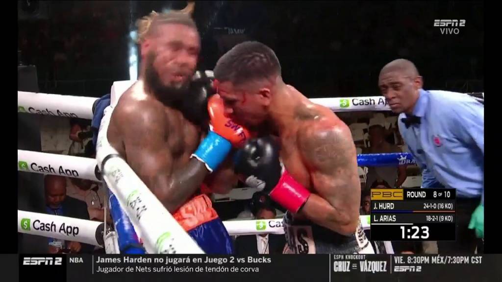 En el minuto medio del noveno asalto, Arias golpeó a Hurd con una mano izquierda justo después de que Hurd conectó una derecha. Hurd se retiró después de absorber ese disparo.La mano derecha cortante de Arias aterrizó casi en la mitad del octavo asalto. Arias atacó a Hurd con otra derecha con poco menos de 30 segundos para el final de esa ronda.