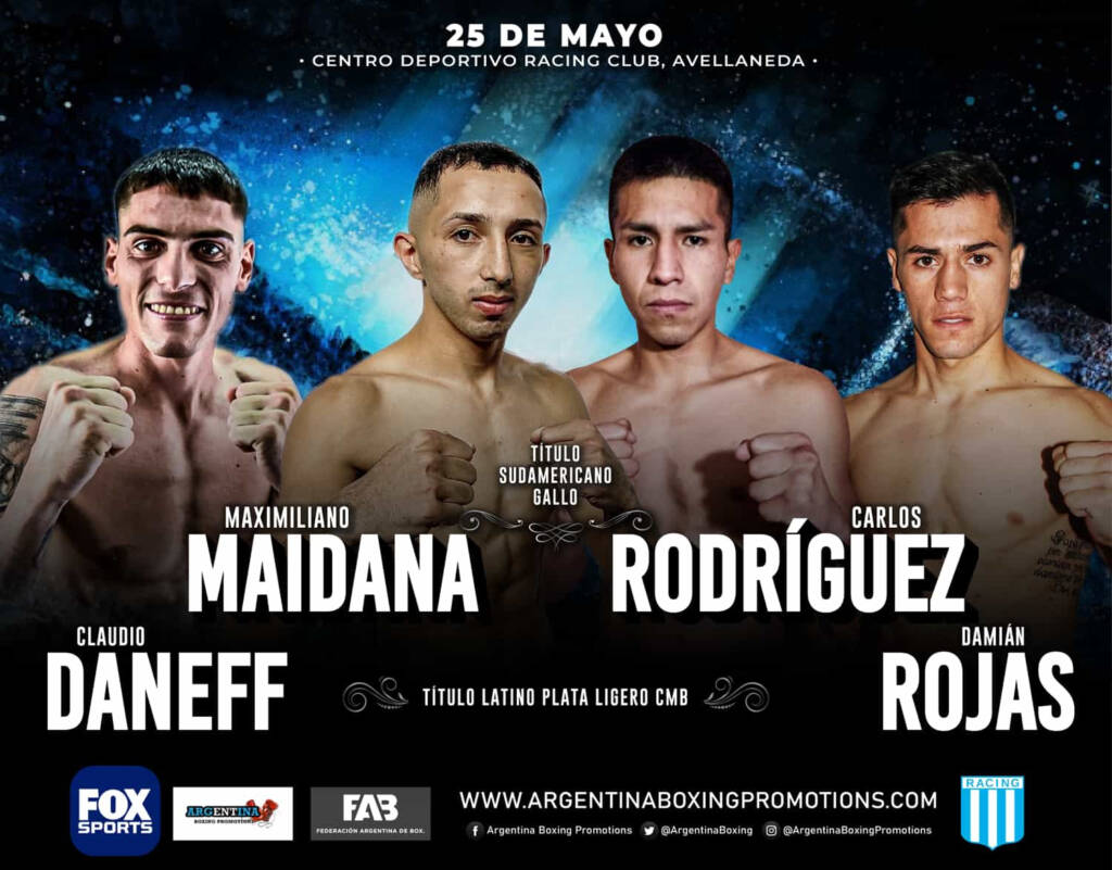 Un nuevo ciclo boxístico comienza. Con dos títulos en juego, grandes figuras y una impactante cartelera, abrirá la temporada de “Argentina Boxing” por Fox Sports. El campeón sudamericano y latino de la Organización Mundial de Boxeo (OMB) gallo, el invicto porteño Maximiliano Maidana, se enfrentará al boliviano Carlos Rodríguez, intentando defender por cuarta ocasión su corona sudcontinental, en uno de los combates estelares de la velada que se desarrollará este sábado, 25 de mayo, en el Centro Deportivo Racing Club, en Avellaneda, provincia de Buenos Aires, Argentina, en una nueva producción de Argentina Boxing Promotions, de Mario Margossian, que será televisada en vivo a través de Fox Sports a partir de las 23 para Argentina y todo el continente en su ciclo Argentina Boxing.
