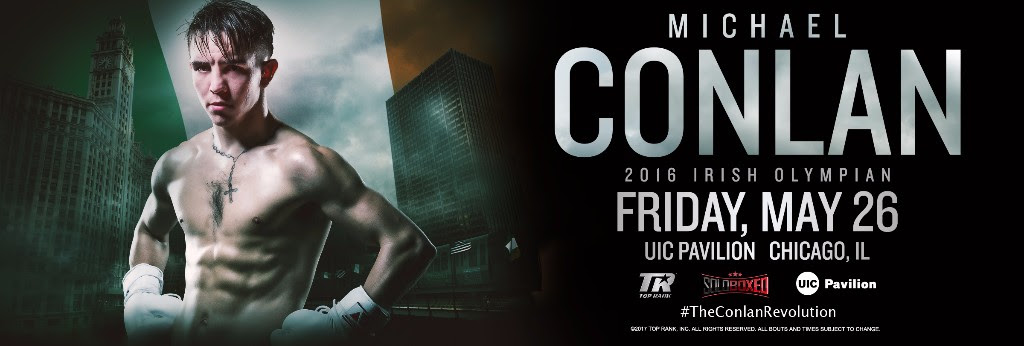 Conlan estelarizará un evento que será televisado nacionalmente el viernes 26 de mayo, en el UIC Pavilion, en un combate a seis asaltos en el peso pluma. En la cartelera también estará en acción el ex campeón mundial ‘Mile High’ Mike Alvarado y el invicto contendiente mundial Alex ‘El Cholo’ Saucedo, en combates a diez y ochos asaltos, respectivamente.En un promoción de Top Rank, boletos para el debut de Conlan en Chicago salen a la venta mañana viernes, 28 de abril, al mediodía CT. Taquillas a precios de $102, $52 y $32, incluyendo cargos aplicables, podrán ser adquiridas en la boletería del UIC Pavilion (Localizada en Racine entre el Gate 3 y el Gate 4), www.Ticketmaster.com y todos los puntos de venta de Ticketmaster. Cargando por teléfono llamando al 800-745-3000. La boletería está abierta de jueves a viernes, de 9 a.m. a 4 p.m. La boletería acepta efectivo, Visa, Mastercard, y Discover. No aceptan cheques, o American Express.