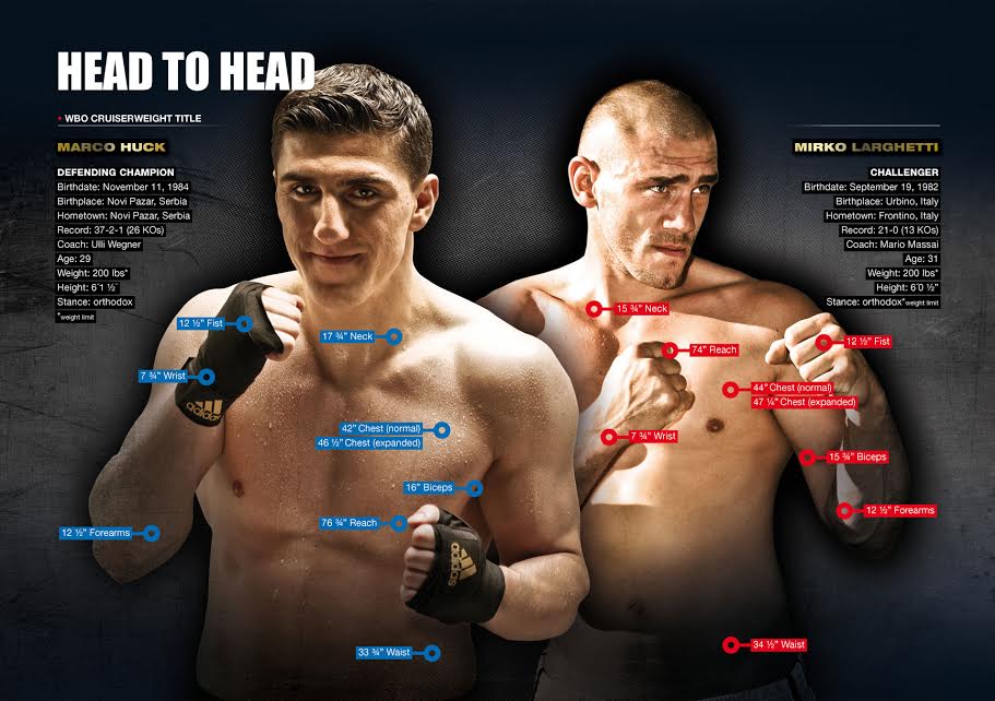 “Tale of the Tape” to this Saturday’s highly anticipated WBO Cruiserweight World Championship between reigning champion Marco Huck (37-2-1, 26 KOs) and challenger Mirko Larghetti (21-0, 13 KOs)at the Gerry Weber Stadium in Halle/Westphalia, Germany. With his 13th successful title defense, Huck would match the division record set by Johnny Nelson. You can use this picture free of charge with reference to the fight.