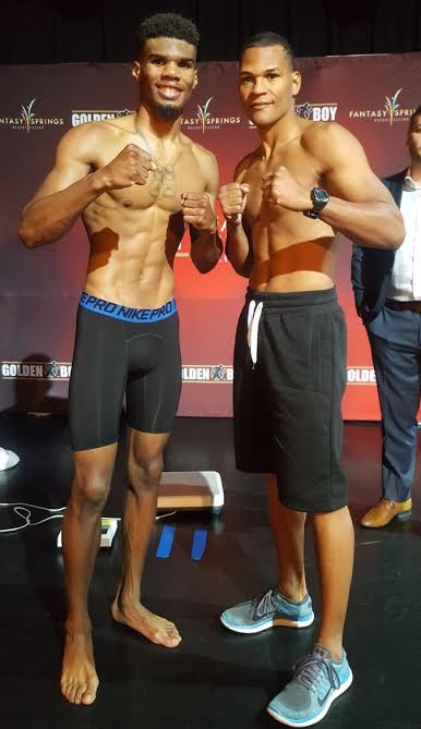Indio, California, ESTADOS UNIDOS – Ganando el primer asalto en la báscula, el contendor dominico-boricua de peso ligero, Marcos ‘El Tigre’ Jiménez (22-7, 15KO’s), – derecha – cumplió con el peso máximo (137 libras) marcando 136.6 libras, pero su rival, el ex integrante de la Selección Nacional de Estados Unidos, Ryan ‘Blue Chip’ Martin (18-0, 11KO’s), – izquierda – se quedó por encima de lo estipulado al pesar 137.6 libras en su primer intento, logrando las 137 libras en una segunda oportunidad, esto para la importante reyerta que sostendrán mañana, viernes, 30 de junio en el Fantasy Springs Casino de Indio, California, en una presentación de Golden Boy Promotions para ESPN2.