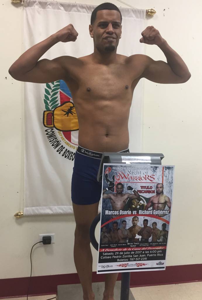 San Juan, PUERTO RICO – Demostrando que han estado trabajando con intensidad para disputar el cinturón Fecarbox Súper Wélter del Consejo Mundial de Boxeo (CMB) el próximo sábado, 29 de julio en el Coliseito Pedrín Zorrilla de San Juan, Puerto Rico, el prospecto boricua, Marcos ‘Marquitos’ Osorio (8-0, 5KO’s), y el veterano púgil colombiano, Richard ‘El Toro’ Gutiérrez (30-17-1, 19KO’s), cumplieron con en el peso requerido a una semana de su combate.