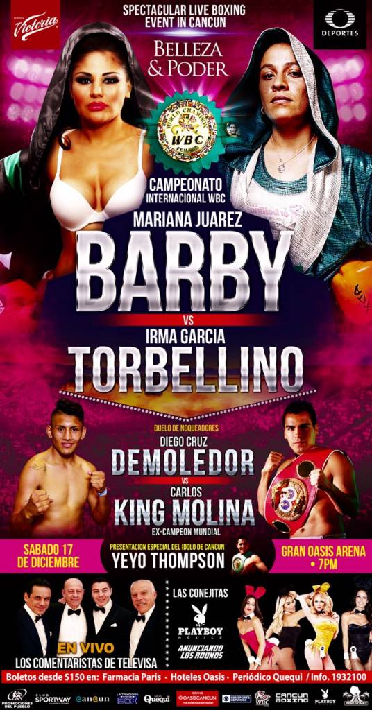 La internacional Oasis Arena de Cancún recibirá tras su remodelación y ampliación un espectacular combate de guantes rosas donde se verán las caras la “Reina de Reinas” Mariana “Barby” Juárez y la excampeona mundial Irma “Torbellino” García en duelo donde estará en juego el campeonato Internacional de peso gallo del Consejo Mundial de Boxeo.