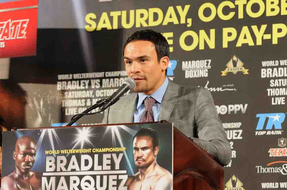 Ahora sí es oficial, Juan Manuel Márquez es rival del invicto campeón welter OMB Tim Bradley y ya hicieron conferencia en Beverly Hill el día 20 para el viernes seguir la propaganda en el corazón de la capital de México.