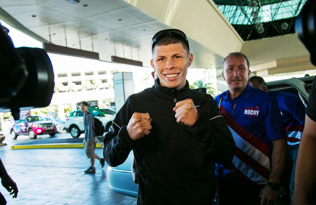 Los peleadores hicieron su promocional entrada oficial al Hotel MGM Grand rodeados de decenas de fanáticos ansiosos por autógrafos y fotos con ellos.