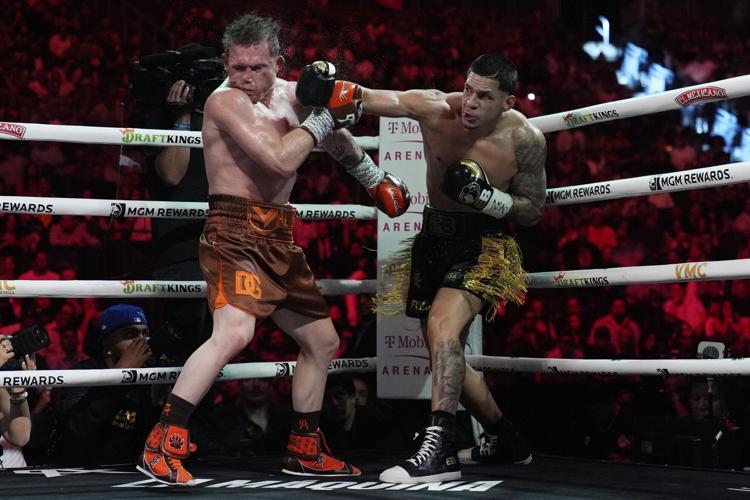 Berlanga conecta un golpe al rostro de Canelo Álvarez en su pelea de septiembre pasado. AP