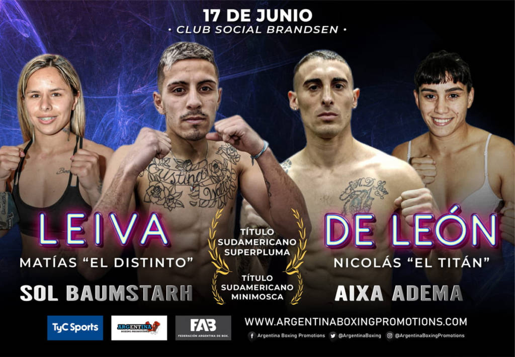 Dos campeones se arriesgan frente a dos exigentes desafíos. Con dos encuentros centrales y acompañados por jóvenes promesas, llega otra noche de la mano de Argentina Boxing Promotions por TyC Sports. El estilista marplatense Matías “El Distinto” Leiva se enfrentará al juninense Nicolás “El Titán” De León, intentando defender por primera ocasión su título sudamericano superpluma, en uno de los combates estelares de la velada que se desarrollará este viernes, 17 de junio, en el Club Social Brandsen, en Brandsen, provincia de Buenos Aires, Argentina, en una nueva producción de Argentina Boxing Promotions, de Mario Margossian, que será transmitida en vivo a través de TyC Sports y TyC Sports Play a partir de las 23, para Argentina y toda América en su ciclo Boxeo de Primera.