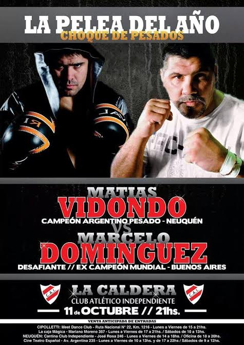 Uno es campeón de un joven reinado. El otro supo tener el mismo cinturón y tocar lo más alto del boxeo mundial. Ahora, el destino los cruza y dejarán todo para irse con el cetro completo. El campeón argentino pesado, el neuquino Matías “El Matador” Vidondo, se enfrentará al ex campeón mundial crucero porteño Marcelo “El Toro” Domínguez, intentando defender por segunda ocasión su corona, en el combate estelar de la velada que se desarrollará este sábado, 11 de octubre, en el Club Atlético Independiente de Neuquén, provincia de Neuquén, Argentina, en una nueva producción de Argentina Boxing Promotions, de Mario Margossian, que será transmitida en vivo a través de TyC Sports a partir de las 23, para Argentina y toda América.