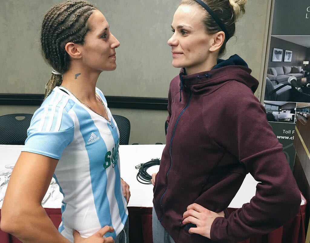 La actual monarca ecuménica AMB/CMB de la división pluma, la santafesina Edith Soledad “la Itaka” Matthysse (14-7-1, 1 KO), y la retadora canadiense, Jelena Mrdjenovich (35-10-1, 19 KO), sortearon con éxito la cita con báscula, de cara al choque mundialista que sostendrán este viernes, 11 de marzo, en el Shaw Conference Centre de la ciudad de Edmonton, Canadá, donde la argentina defenderá sus reinados. La transmisión del mismo estará a cargo de TyC Sports, en vivo, a través de su tradicional ciclo, Boxeo de Primera, a partir de las 00:50 de la madrugada del sábado 12.