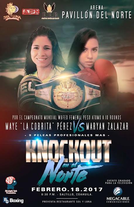 La cartelera denominada “Knockout en el Norte”, que podrá ser vista a todo lo largo de la República Mexicana a través de la señal de MegaCable, tendrá como platillo principal el duelo que sostendrán la local Mayela Pérez y la hidrocálida Maryan Salazar, por el campeonato de la Federación Mundial de Boxeo (WBF, por sus siglas en inglés), de peso átomo.