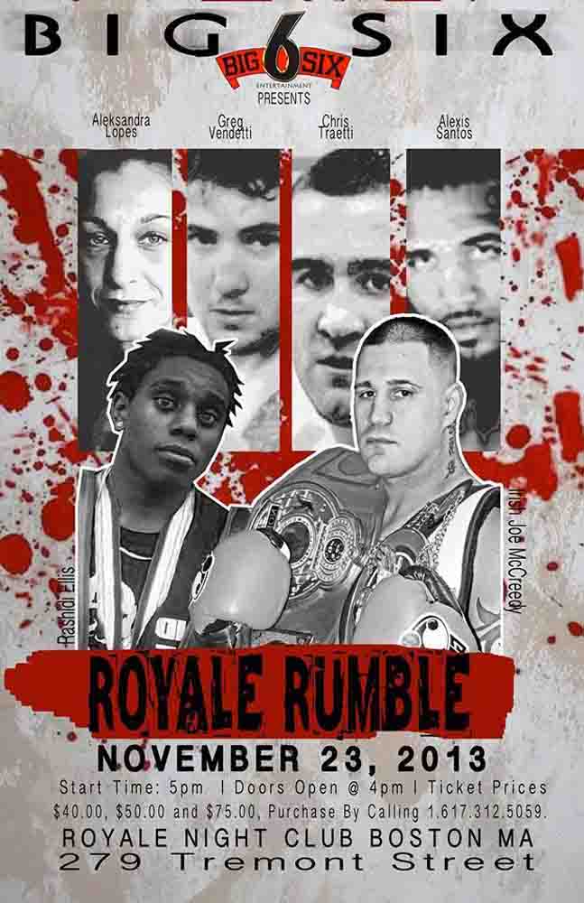 PROVIDENCE (Nov. 14, 2013) – Two of New England’s best and most popular boxers, “Irish” Joey McCreedy and Chris Traietti, will be fighting in the main event and co-feature, respectively, on the “Royale Rumble” card, presented by Big Six Entertainment, November 23 on a special Saturday afternoon card (5 p.m. ET start) at The Royale Nightclub Boston (formerly The Roxy).