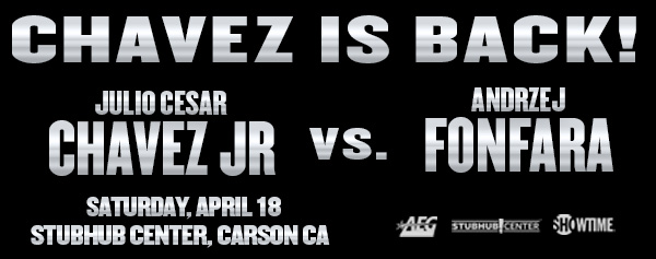 CARSON, Calif. (March 9, 2015) – The return of Julio Cesar Chavez Jr. (48-1-1, 32 KOs) comes to StubHub Center in Carson, Calif., on Saturday April 18 as the Mexican superstar makes his SHOWTIME CHAMPIONSHIP BOXING® debut against exciting brawlerAndrzej Fonfara (26-3, 15 KOs) in a 12-round light heavyweight bout, live on SHOWTIME(10 p.m. ET/ 7 p.m. PT).
