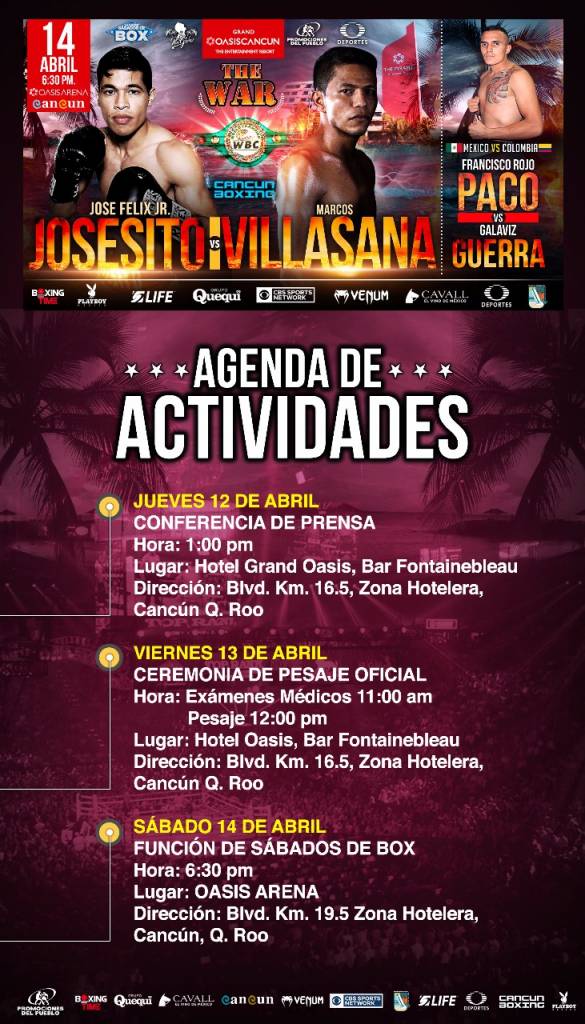 La explosiva velada que organiza Promociones del Pueblo en asociación con Cancún Boxing de Pepe Gómez y Boxing Time Promotions de Memo Rocha, con el apoyo de Cavall Sport y Playboy México; es encabezada por el duelo donde el acapulqueño Marcos Villasana Jr. se juega el título Internacional WBC de peso liviano frente al sinaloense José ‘Josesito’ Félix Jr. en la Oasis Arena.