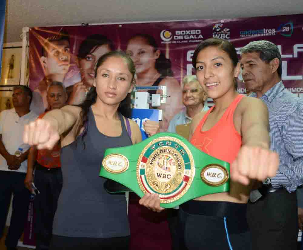 En combate que se espera de grandes emociones Yésica Nery (derecha) expone por quinta ocasión el título mundial Juvenil minimosca WBC ante la tlaxcalteca Alejandra López (izquierda), la noche de este sábado en el Centro de Convenciones del IMSS / Presentaciones estelares de Juan Antonio Rodríguez, Ramiro Robles, Martín Islas y Hugo “Chacal” Hernández.
