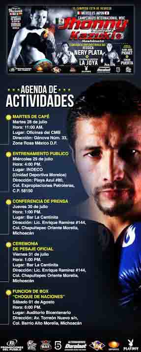 Intensa será la agenda de actividades que tendrán los protagonistas de la velada “Choque de Naciones” que encabeza el triple campeón mundial Jhonny González, quien buscará el cinto Internacional del Consejo Mundial de Boxeo frente al japonés Kazuki Hashimoto este 1 de agosto en duelo que será transmitido a todo el país completamente en vivo por la señal de “Sábados de Box” de Televisa Deportes.