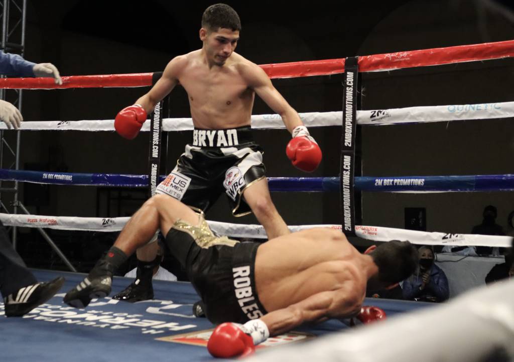 Bryan “Latino” Acosta superó una prueba difícil, y en base a un boxeo de clase, de precisión y poder, e imponiéndose tanto a la larga distancia como en corto, defendió el campeonato Fecarbox Pluma CMB, al noquear en el séptimo round al tijuanense Pablo “Diamante” Robles, en la pelea estelar de la función que presentó 2M Promotions la noche de este viernes en Hermosillo, y que fue transmitida a nivel internacional por ESPN Knock Out, y a nivel regional por Telemax.