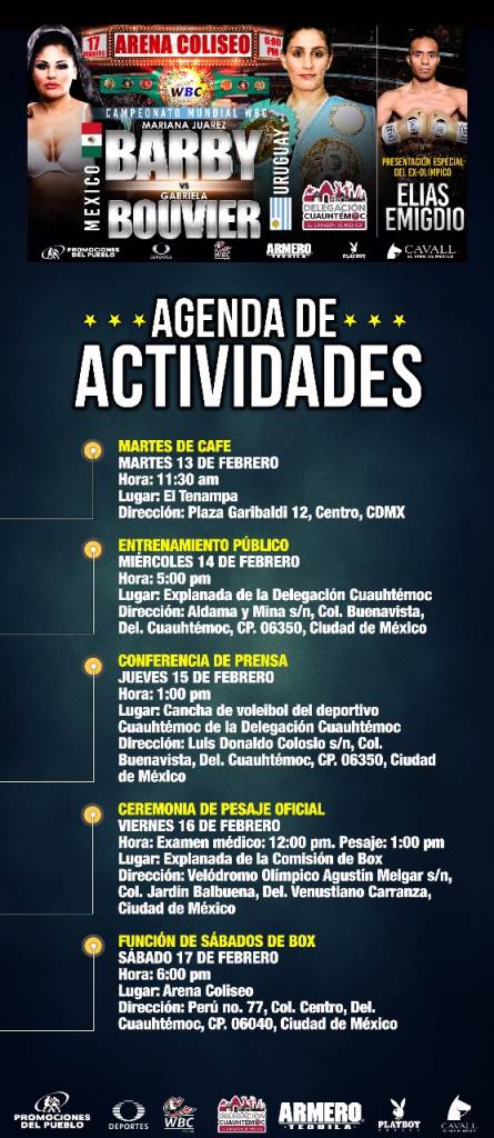 La cartelera que organiza Promociones del Pueblo con el apoyo de Cavall Sport, Tequila Armero y Playboy México y que ha recibido todas las facilidades de parte de la Delegación Cuauhtémoc que dirige el Lic. Rodolfo González Valderrama, y del Lic. Héctor Garcia Antonio, subdirector de Deporte, en la que se verán las caras la campeona mundial Mariana ‘Barby’ Juárez y la ex campeona mundial uruguaya Gabriela Bouvier; además de la participación del olímpico mexicano Elías ‘Tigre de Zitlala’ Emigdio y el novato sensación Karim ‘Traviesito’ Arce.