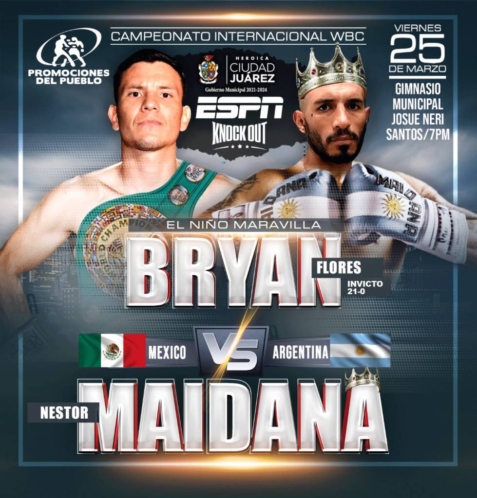 Cuando mexicanos y argentinos se encierran en un rombo de batalla, el espectáculo está garantizado; tal y como sucederá él próximo viernes 25 de marzo cuando se enfrenten el juarense Bryan ‘Niño Maravilla’ Flores y el noqueador Nestor ‘CH’ Maidana en el turno estelar de la transmisión en la señal internacional de ESPN Knockout.