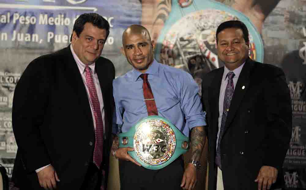 Miguel Ángel Cotto, el único peleador de Puerto Rico que ha conquistado un título mundial en cuatro divisiones diferentes, recibió hoy el cinturón verde y oro del Consejo Mundial de Boxeo en San Juan de Puerto Rico.