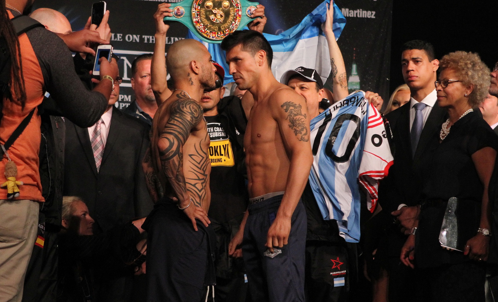 Three-time world champion Miguel Cotto of Puerto Rico and WBC world Middleweight champion Sergio Martinez weigh in (Cotto 155 lbs, Martinez 158.8 lbs) Friday for their eagerly-anticipated World Middleweight Championship.