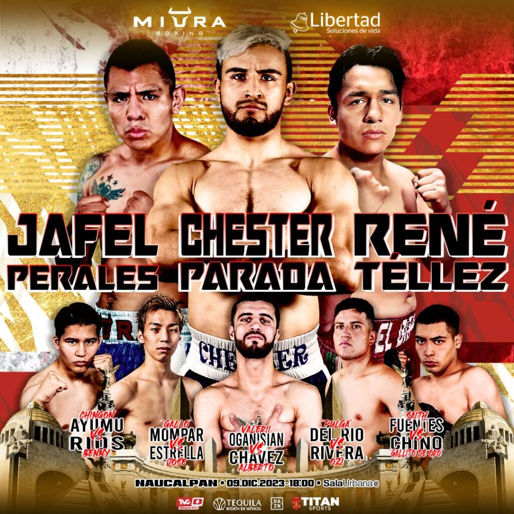 Óscar Jafel Perales Castelán (19-2-2, 9 Ko’s) combatirá a ocho capítulos ante el lagunero Eliot Edgar Chávez Espinoza (11-6-1, 6 Ko’s), en el que será el duelo semiestelar de la velada que podrá ser vista a través de TVC Deportes para todo México, y DAZN para el resto del mundo a partir de las 8:00 pm.