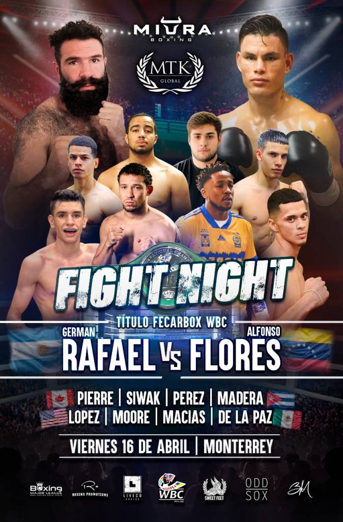 “Fight Night” es el nombre que recibió el atractivo cartel que ofrecerá el próximo viernes 16 de abril en Monterrey, Nuevo León, las empresas promotoras Miura Boxing Promotions y MTK Global, en asociación con Boxing Major League (USA), LiveCo Boxing (CAN), 1 Round Más (MEX), Warriors Boxing (MEX) y ODD SOX (USA), que promete ser una velada llena de emociones con duelos de corte internacional.