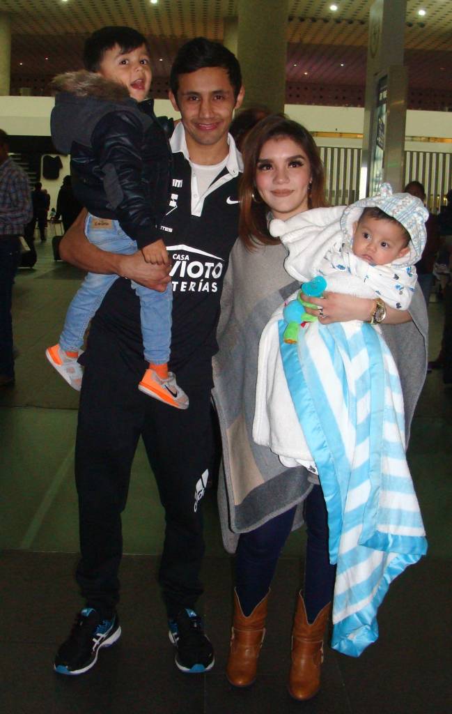 Janine Martínez, esposa de Fuentes, y quien traía en sus brazos a su pequeño hijo de cinco meses Santiaguito y Moisés junior, despidió a su marido con un apasionado beso y una breve platica, deseándole éxito y que “vuelva a México con el título mundial”, comentó.