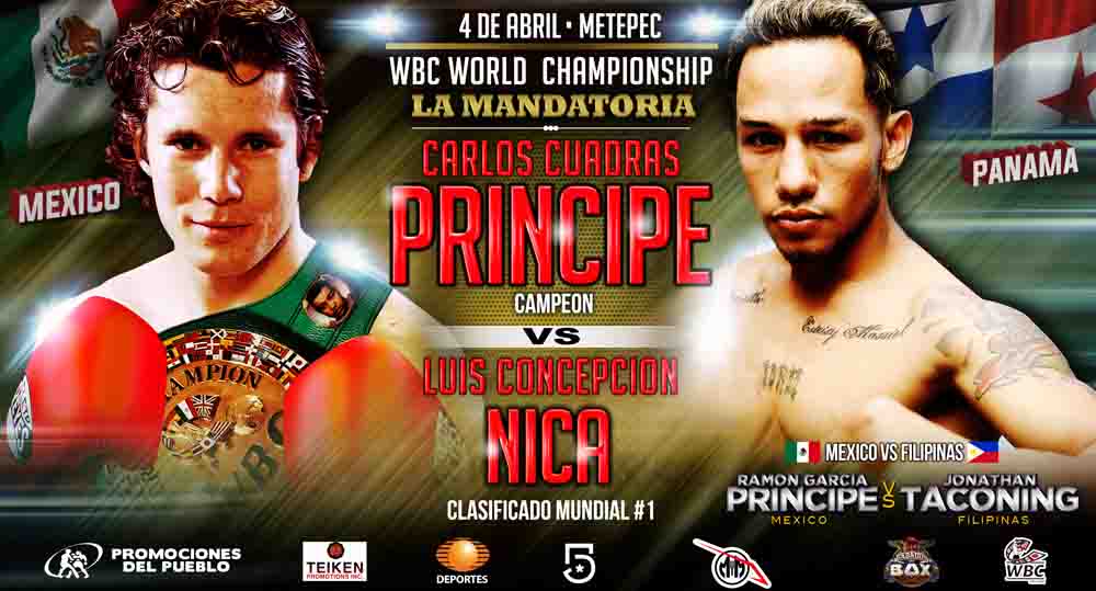 La cartelera que organiza Promociones del Pueblo, en asociación con Teiken Promotions y el empresario Salvador Briman, es patrocinada por Duralast y tendrá como respaldo el pleito entre el excampeón mundial Ramón “Príncipe” García y el clasificado mundial filipino Jonathan “Relámpago” Taconing que podría arrojar al próximo retador al campeonato universal de peso minimosca que ostenta el mazatleco Pedro Guevara.