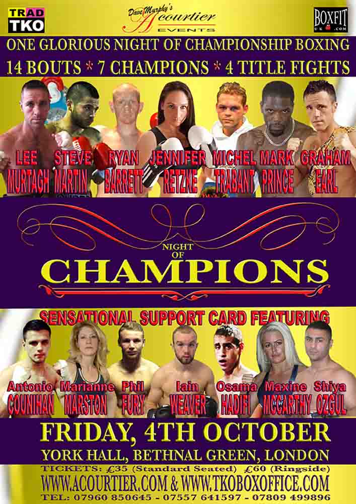 Dave Murphy’s Acourtier Events, promoted ‘NIGHT OF CHAMPIONS event, which takes place at York Hall in Bethnal Green, London, on Friday 4th October 2013.