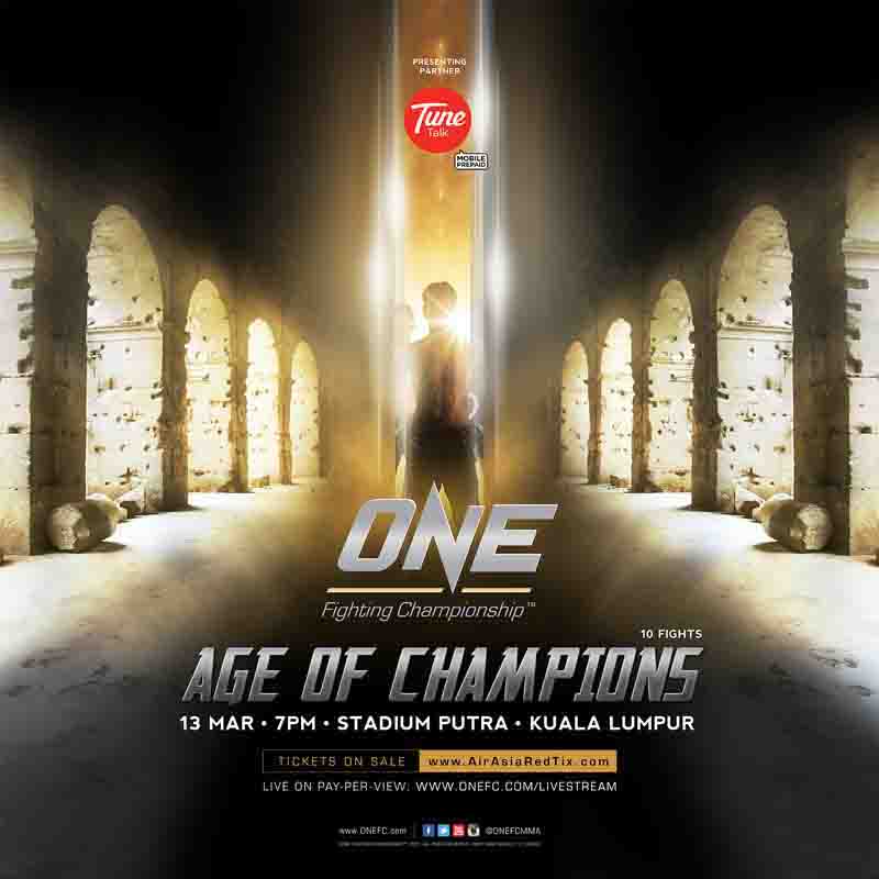 Tickets for ONE FC: AGE OF CHAMPIONS, presented by Tune Talk, are on sale now at www.AirAsiaRedTix.com. Ticket categories begin with the full Red Carpet and cageside experience for VVIPs at RM388 followed by VIP RM278, Gold RM168, Silver RM108 and Bronze RM58. Early bird promotions for Gold, Silver and Bronze categories are available until 31 January. Prices include ticketing fee.