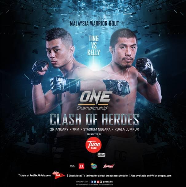 13 January 2016 – Kuala Lumpur, Malaysia: The largest sports media property in Asian history, ONE Championship™ (ONE) together with Tune Talk, will launch the second event of 2016 in style as the promotion heads back to Kuala Lumpur, Malaysia on 29 January for ONE: CLASH OF HEROES. In the main event featuring a Malaysia Warrior Bout, hometown hero Ev “E.T.” Ting squares off with one of the Philippines’ finest in Eric “The Natural” Kelly.