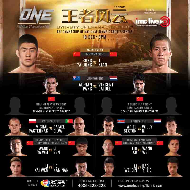 ONE FC: DYNASTY OF CHAMPIONS will take place at The Gymnasium of National Olympic Sports Centre in Beijing on 19 December. Tickets for ONE FC: DYNASTY OF CHAMPIONS are on sale now at 永乐票务 (WWW.228.COM.CN). Ticket categories begin with the full Red Carpet and cageside experience for VIPs at RMB 1080.Tickets priced at RMB 780, RMB 580, RMB 380, RMB 280 and RMB 180 are also available. Prices include ticketing fee.