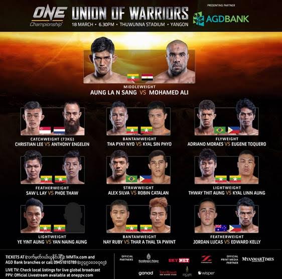 07 March 2016 – Yangon, Myanmar: The largest sports media property in Asian history, ONE Championship™ (ONE), in partnership with AGD Bank, returns to Yangon to bring world-class mixed martial arts (MMA) action to combat sports fans in Myanmar. The Thuwanna Indoor Stadium is set to play host to ONE: UNION OF WARRIORS on 18 March. The card will be headlined by hometown hero, “The Burmese Python” Aung La N Sang, as he takes one Mohamed Ali of Alexandria, Egypt.