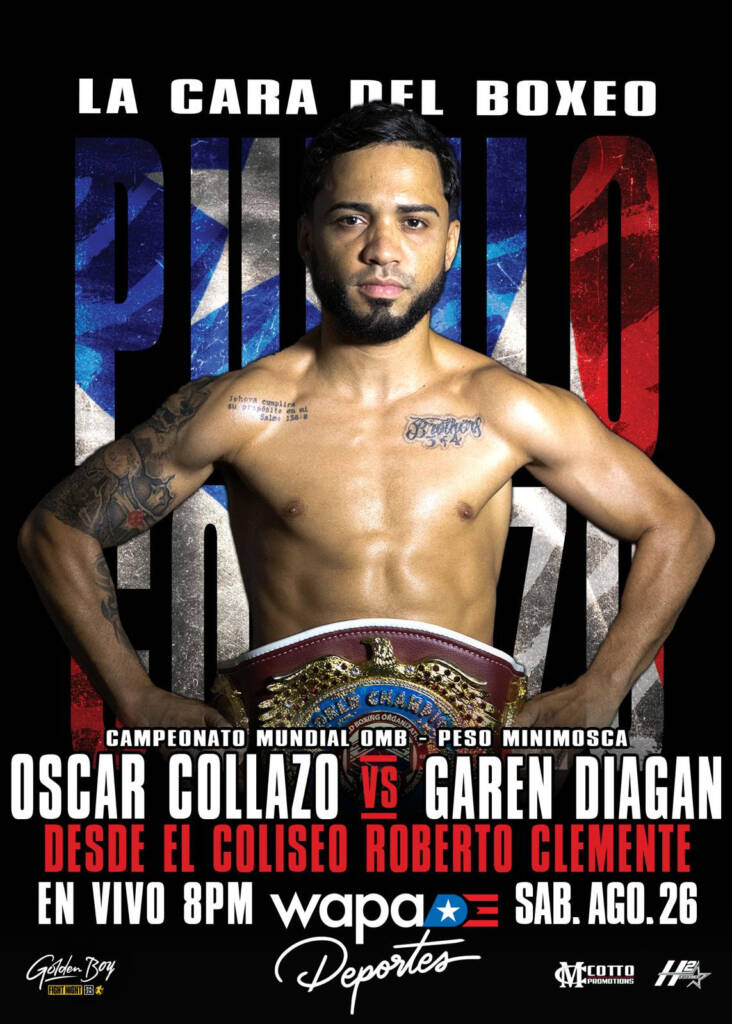 San Juan, PUERTO RICO — WAPA Deportes, canal 100% local dedicado a programación deportiva, anuncia la transmisión en vivo y en exclusiva del Campeonato Mundial OMB peso mini mosca, donde el boxeador puertorriqueño Oscar ‘El Pupilo’ Collazo se enfrentará al filipino Garen Diagan en un emocionante combate. El evento se llevará a cabo el sábado 26 de agosto en el Coliseo Roberto Clemente.