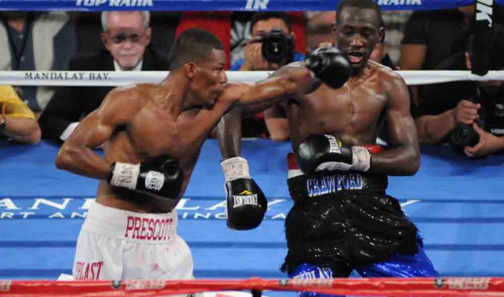 En la pelea semiestelar Terence Crawford (derecha) continua invicto en superligero con 20-0 al dar cuenta en 10 rondas del colombiano Breideis Prescott (izquierda) en una pelea que causó el abucheo del público por tanto estudio en vez de pelea en ocasiones, pero desde el principio Crawford puso las reglas de autoridad para ganar cómodamente en las tres tarjetas oficiales, anotando 48 golpes más en el conteo computarizado 10 jabs y 28 golpes de contundencia.