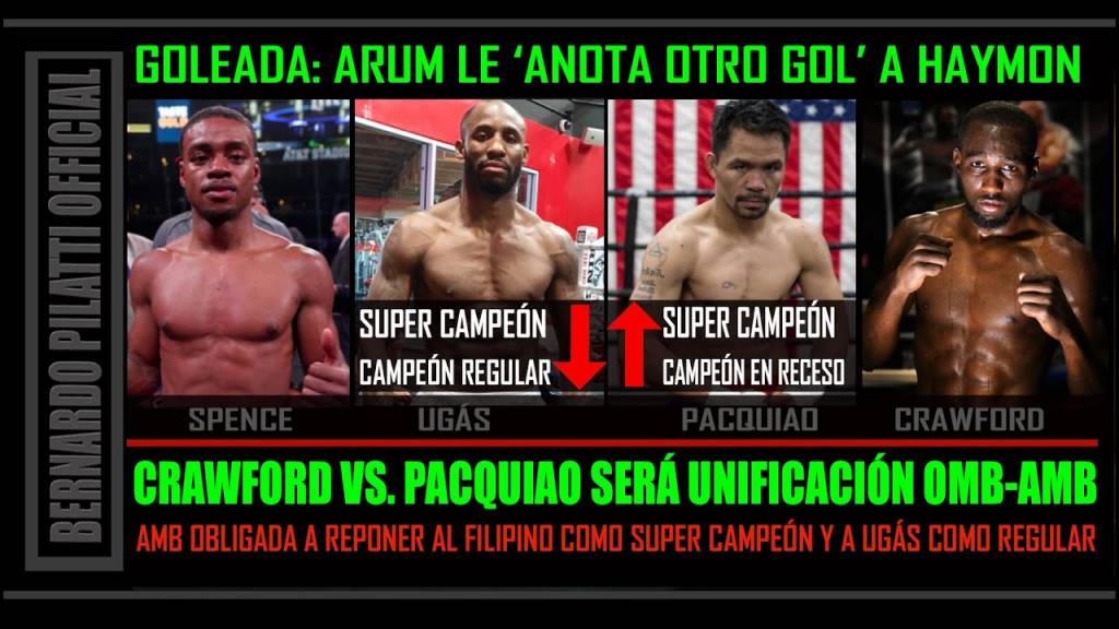 El problema para el Grupo Haymon, es que eso afectará la pelea en gestión entre Errol Spence y Ugás donde se unificarían los títulos AMB de Ugás con los FIB Y CMB de Spence. Con la movida de Bob Arum, se unificará la AMB de Pacquiao con el de la OMB de Terence Crawford.
