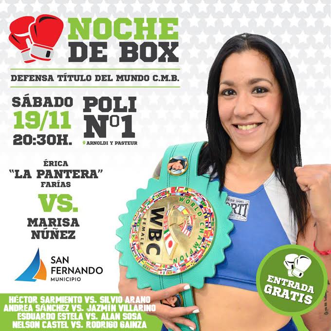 En el tope central de la noche, la talentosa bonaerense del partido de San Fernando, Érica Anabella “Pantera” Farías (23-1-0, 10 KO), defenderá por tercera ocasión su título mundial superligero/63,503 kg del Consejo Mundial de Boxeo (CMB), esta vez ante la férrea bonaerense de la ciudad de Tandil y ex titular ecuménica FIB de la división, Marisa Gabriel “la Brava” Nuñez (7-6-2), en combate pactado a la distancia de diez asaltos de 2×1.