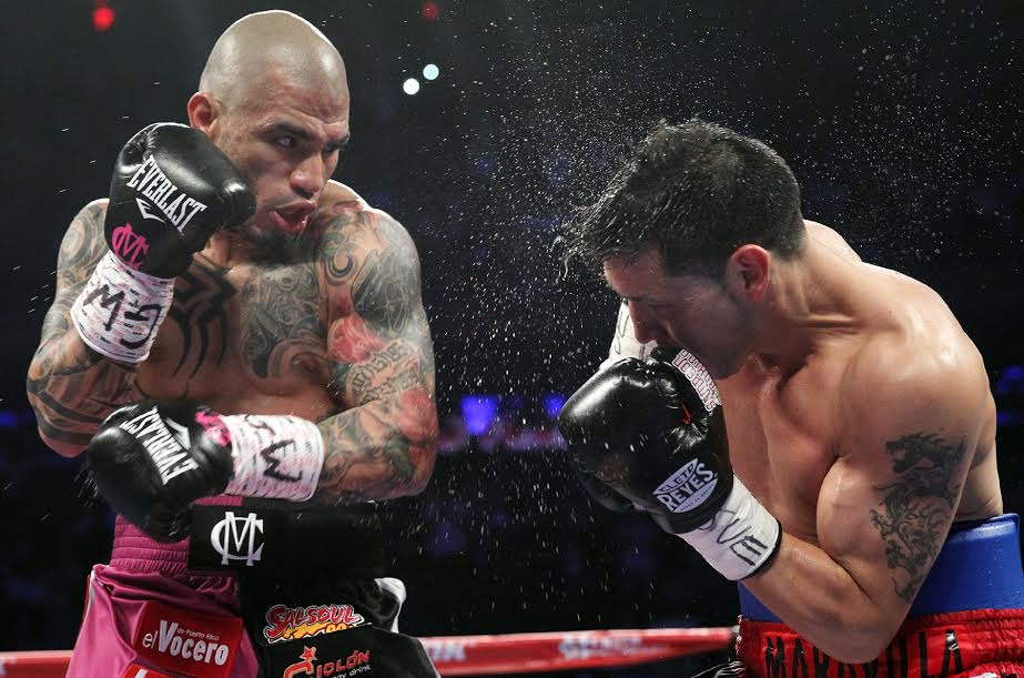 Cotto makes history as he becomes the first Puerto Rican to win a world titles in four different divisions. This was a great occasion, but not really a great fight after the first round. In those sensational first three minutes Cotto came out determined and focused and fast and Martinez seemed to have no punch resistance and no balance. He was first staggered by a punch that did not look that hard. Cotto immediately pounced and two clubbing lefts put Martinez down. He was up quickly but looked unsteady. He tried to keep Cotto away but the Puerto Rican landed another left hook and down went Martinez again. He was up quickly but immediately under pressure and went down for a third time, The three knockdown rule was not in effect or it would have been all over then. After getting up Martinez just made it to the bell but went back to his corner on unsteady legs already looking a beaten fighter. After that first round the fight was totally Cotto’s Martinez tried to get his act together, but he was never ready to stand and trade and Cotto dominated from centre ring throwing and landing more punches with Martinez looking vulnerable every time there was hard exchange. Martinez was never able to keep Cotto out and his jab was ineffective. Round after round went to Cotto as he slowly broke down the champion literally as Martinez suffered a broken nose and a cut on the right side of his head and on his right eyebrow. Martinez was down very briefly in the ninth, his glove just touching the canvas during a quick exchange of punches but the referee ruled it a knockdown. With the first round being scored 10-6 by all three judges, with Cotto winning every round between the second and the eighth by 10-9, and with the knockdown in the ninth being a 10-8 round Cotto was in front by a huge 13 points on all three cards. There were heated arguments in the corner of Martinez with his trainer trying to convince the brave champion that it was a lost cause but with Martinez wanting to fight on. In the end his trainer’s advice won out and Martinez surrendered his title. Cotto may be 33 but looked a new man so obviously working with Freddy Roach has done wonders for him. The former WBO light welter, WBO welter and WBA light middle champion looked to be on the way out after a lackluster loss to Austin Trout in 2012 but now there is a whole list of potential big paydays out there : Mayweather, Alvarez, Pacquiao etc.. Martinez looked all of his 39 years but the 14 months out of the ring and his serious leg injury may all have been factors. He is reviewing his options with retirement a possibility and if he decides to go down that route then he can have pride in a truly great career4.