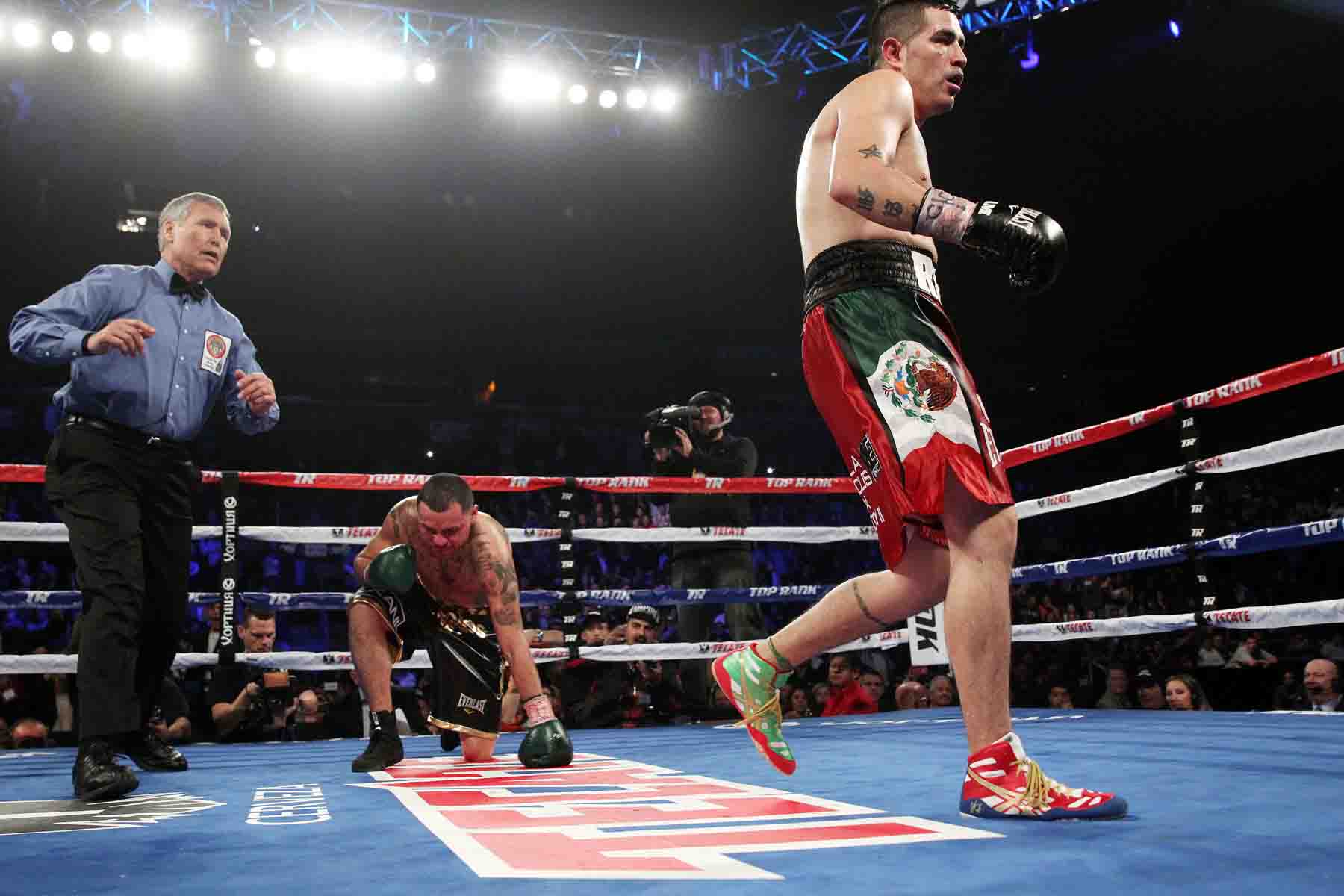 Mendez returns to action after recovering from a shoulder injury and gets a win, but this one caused by an injury to his opponent. Mendez made a confident start taking the fight to Berrospe and scoring with good hooks and forcing him back with a strong jab. At the end of the round Berrospe’s arm looked swollen and the doctor confirmed he had ruptured his bicep so the fight was over. The 25-year-old lanky “El Gallo Negro” wins the vacant IBA title. He has a 13 bout unbeaten streak including a draw with current interim WBA champion Dmitry Chudinov. After being out for 9 months with the injury he is looking to get into some high profile matches. Mexican Berrospe was having his first fight since September 2013 and is facing another long lay-off.
