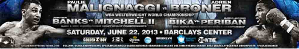 Malignaggi vs. Broner, a 12-round fight for Malignaggi’s WBA Welterweight World Championship, will take place Saturday, June 22, 2013 at Barclays Center in Brooklyn, New York. The event is promoted by Golden Boy Promotions and R & R Promotions, supported by Golden Boy Promotions’ sponsors Corona and AT&T and will be televised live on SHOWTIME CHAMPIONSHIP BOXING® beginning at 9:00 p.m. ET/6:00 p.m. PT. In the co-featured bouts, Johnathon Banks will look to repeat his 2012 upset win over Seth “Mayhem” Mitchell as he defends his NABO and WBC International Heavyweight titles in a 12-round fight presented in association with K2 Promotions and number one rated WBC super middleweight contender Sakio Bika faces number four rated WBC super middleweight contender Marco Antonio Periban in a 12-round fight for the vacant WBC Super Middle weight World Championship. SHOWTIME CHAMPIONSHIP BOXING® is available in Spanish on secondary audio programming (SAP). Preliminary fights will air on SHOWTIME EXTREME at 7:00 p.m. ET/PT (delayed on the West Coast).