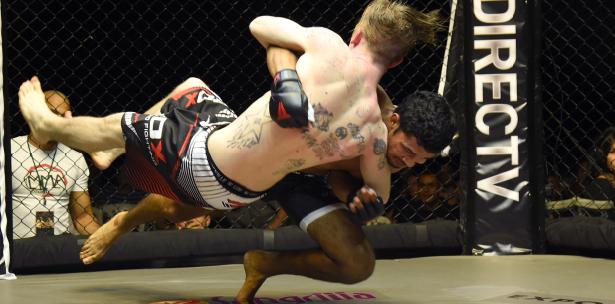 El boricua Billy Molina lanza al estadounidense Thomas Petty a la lona para luego rendirlo con un ‘rear-naked choke‘ durante el primer asalto de su reyerta el sábado en MaxxFC30 en Bayamón. (andre.kang@gfrmedia.com)
