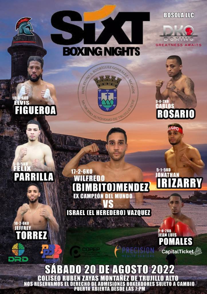 El viequense Carlos Rosario (4-0, 2 KOs), medirá fuerzas contra el cagueño Ángel Velázquez (4-2, 3 KOs) en duelo pactado a seis asaltos en las 130 libras. El invicto Rosario estará realizando su primera pelea en suelo boricua, mientras que Velázquez, quien ya tiene victorias previas sobre los invictos José Castro y Christian Lebrón, buscará añadir a su resume su tercera victoria sobre un invicto prospecto en ascenso.