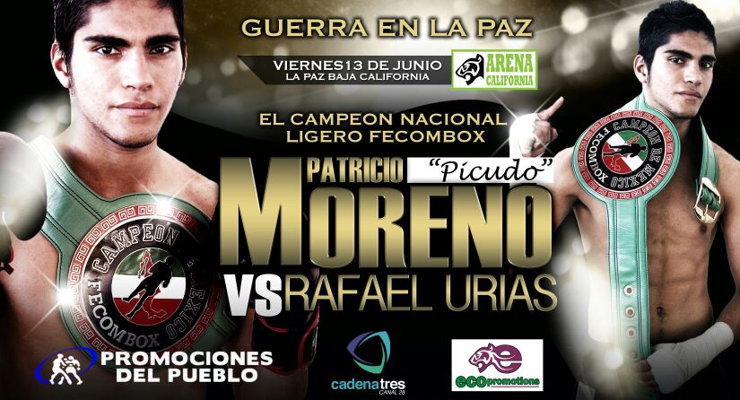Nuevamente la Arena California, en La Paz, capital de Baja California Sur; recibe una velada de primer nivel, cuando el campeón Nacional FECOMBOX de peso ligero, el local Patricio “Picudo” Moreno ponga en juego la correa avalada por el CMB, ante el excampeón nacional Rafael “Canelo” Urias este viernes 13.