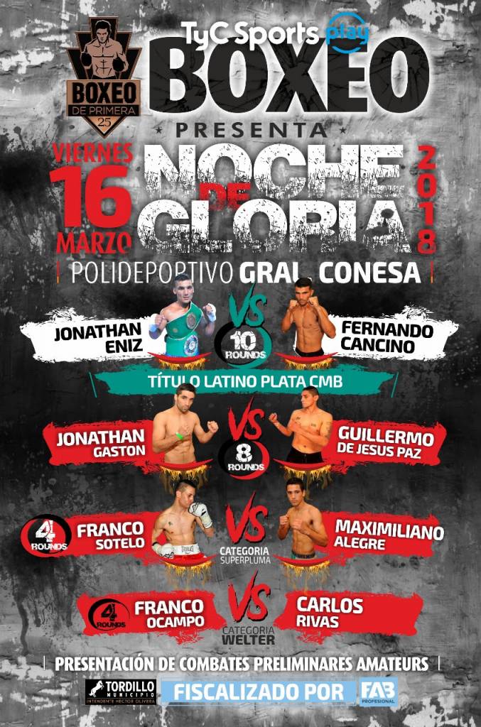 En el pleito que encabezará la jornada, se pondrá en disputa el título latino versión plata, categoría superligero/63.503 kg, perteneciente al Consejo Mundial de Boxeo (CMB), que expondrá por primera vez el bonaerense del partido de Dolores, el ascendente y sorprendente Jonathan José “Potro” Eniz (19-9-1, 9 KO), quien se verá las caras con el áspero y complicado chaqueño de la localidad de Las Breñas, Fernando Daniel “Trapo” Cancino (6-2-1, 2 KO). El mismo se llevará a cabo a la distancia de 10 rounds de 3×1.