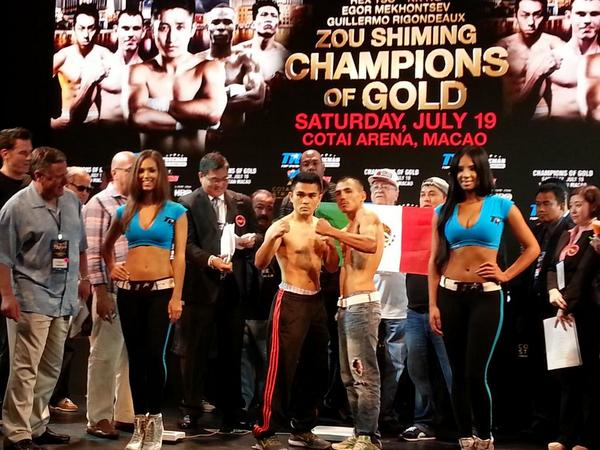 Esta madrugada en México y tarde de China, el ídolo del boxeo local José Alfredo Zúñiga (derecha) de la Escuela de Boxeo Roberto Almazán detuvo la bascula sin problemas para marcar 122.5 lbs en un limite pactado de 113, sin problemas para enfrentar al 4 veces campeón del mundo Brian Viloria (izquierda) que marco el peso exactamente igual al del mexicano.